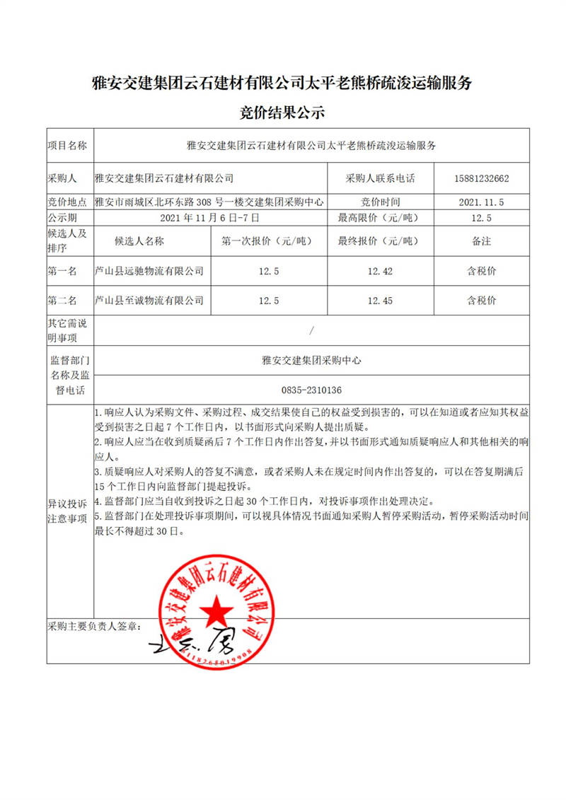 雅安交建集團(tuán)云石建材有限公司太平老熊橋疏浚運(yùn)輸服務(wù)競(jìng)價(jià)結(jié)果公示