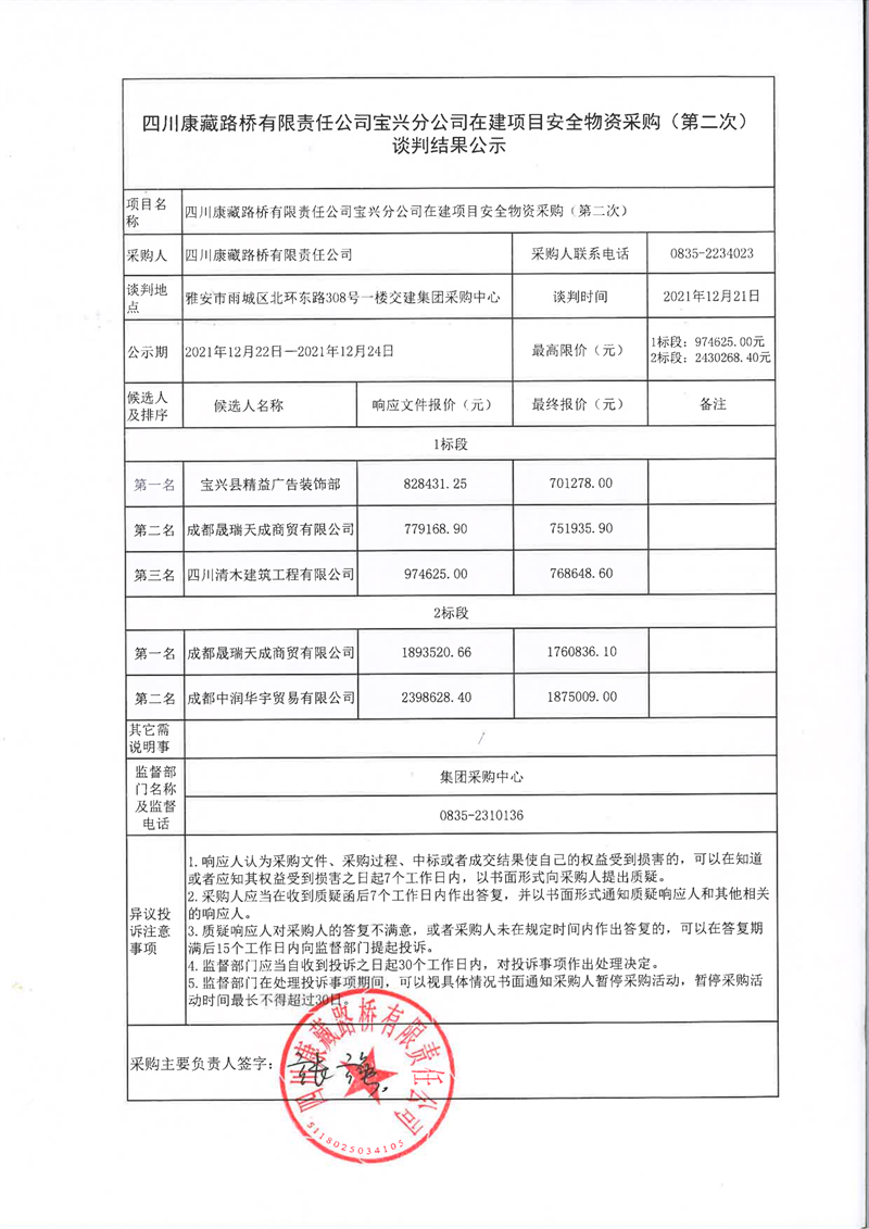 四川康藏路橋有限責任公司寶興分公司在建項目安全物資采購(第二次)談判結(jié)果公示