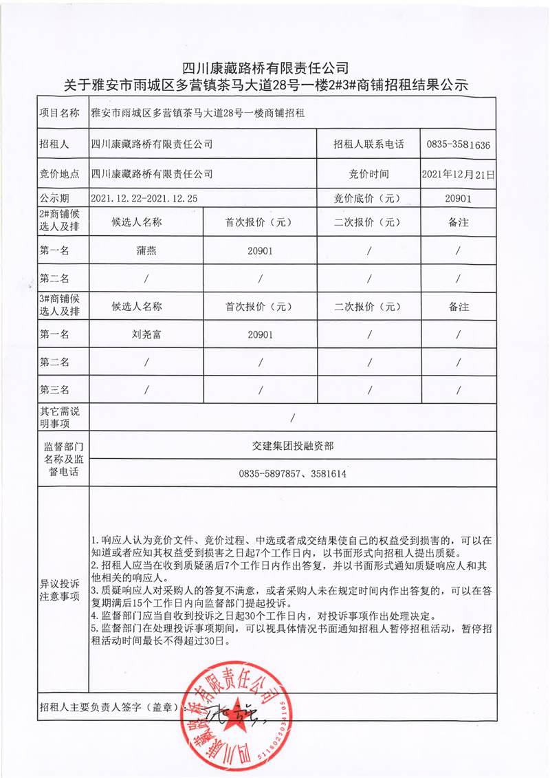 四川康藏路橋有限責(zé)任公司關(guān)于雅安市雨城區(qū)多營(yíng)鎮(zhèn)茶馬大道28號(hào)一樓2#3#商鋪招租結(jié)果公示