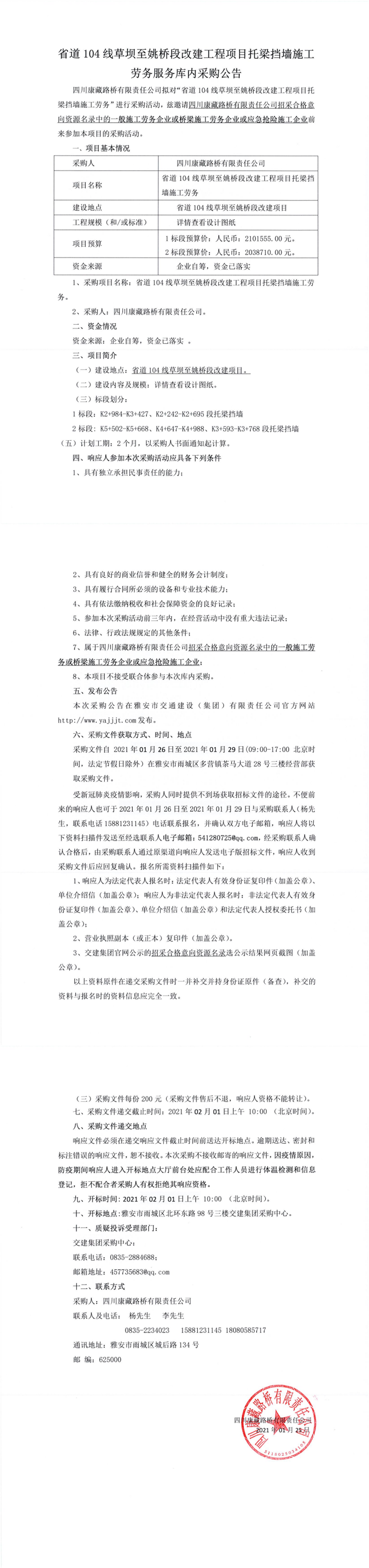 四川康藏路橋有限責(zé)任公司省道104線草壩至姚橋段改建工程項(xiàng)目托梁擋墻施工勞務(wù)服務(wù)庫內(nèi)采購公告