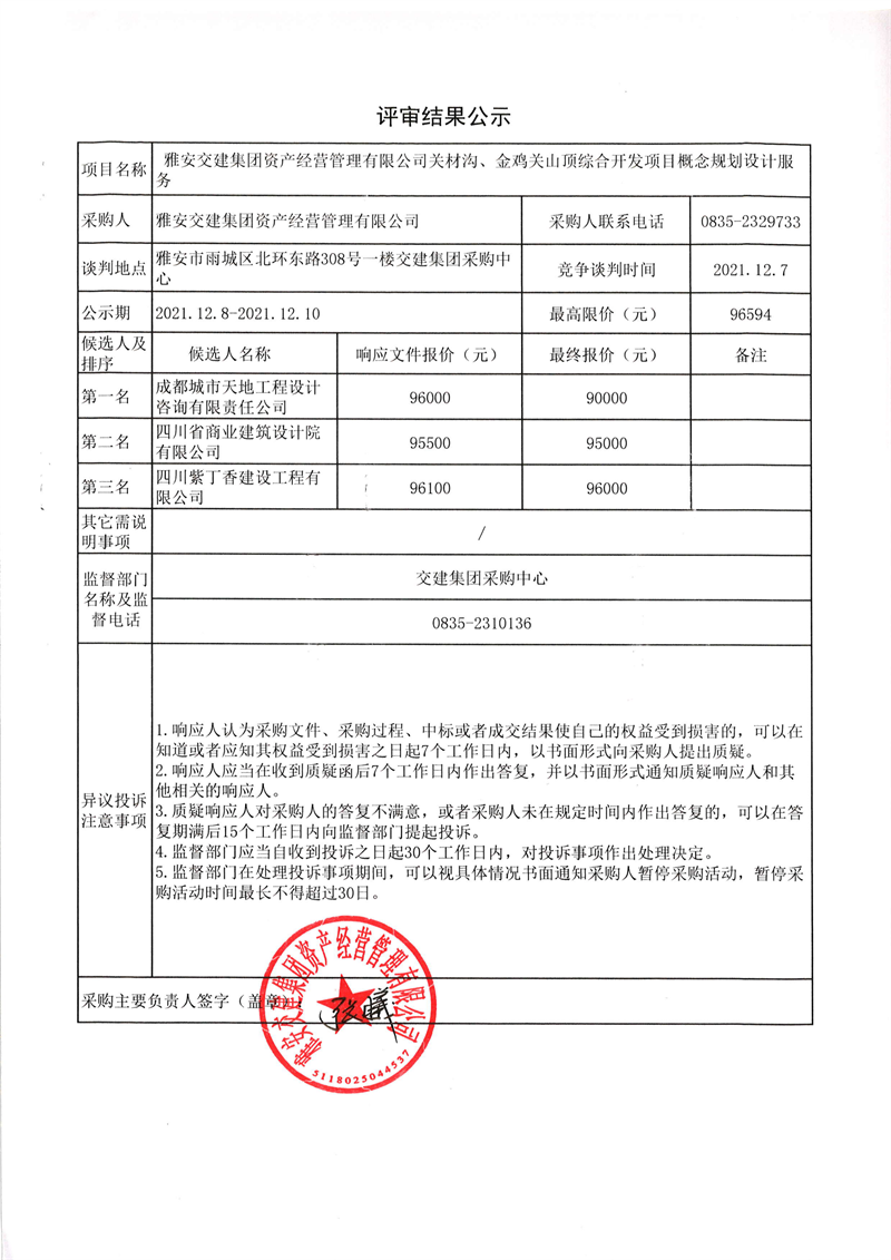 雅安交建集團資產(chǎn)經(jīng)營管理有限公司關(guān)材溝、金雞關(guān)山頂綜合開發(fā)項目概念規(guī)劃設(shè)計服務(wù)評審結(jié)果公示