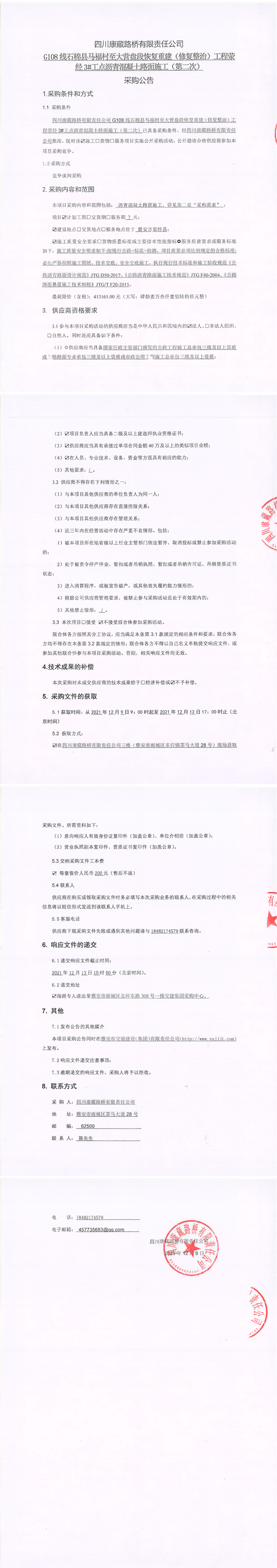四川康藏路橋有限責(zé)任公司G108線石棉縣馬福村至大營盤段恢復(fù)重建(修復(fù)整治)工程滎經(jīng)3#工點(diǎn)瀝青混凝土路面施工(第二次)采購公告