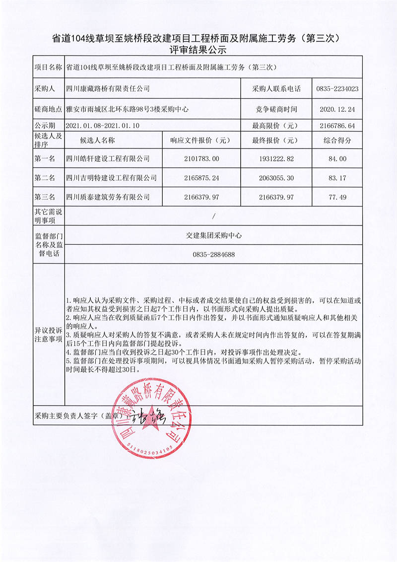 四川康藏路橋有限責任公司省道104線草壩至姚橋段改建項目工程橋面及附屬施工勞務(wù)(第三次)評審結(jié)果公示