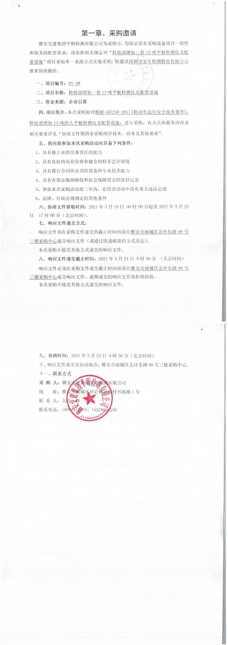 雅安交建集團(tuán)平順檢測(cè)有限公司檢驗(yàn)部增加一套13噸平板檢測(cè)儀及配套設(shè)施單一來源采購邀請(qǐng)