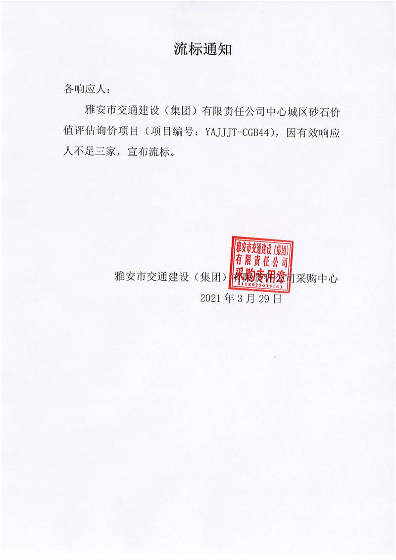 雅安市交通建設(shè)(集團(tuán))有限責(zé)任公司中心城區(qū)砂石價(jià)值評(píng)估項(xiàng)目流標(biāo)通知