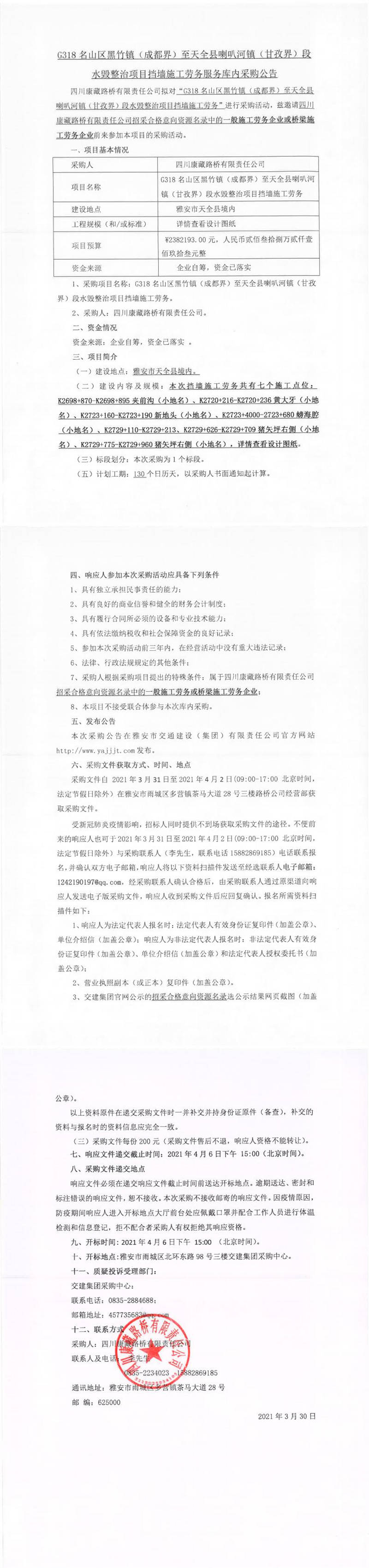 四川康藏路橋有限責(zé)任公司G318名山區(qū)黑竹鎮(zhèn)(成都界)至天全縣喇叭河鎮(zhèn)(甘孜界)段水毀整治項目擋墻施工勞務(wù)服務(wù)庫內(nèi)采購公告