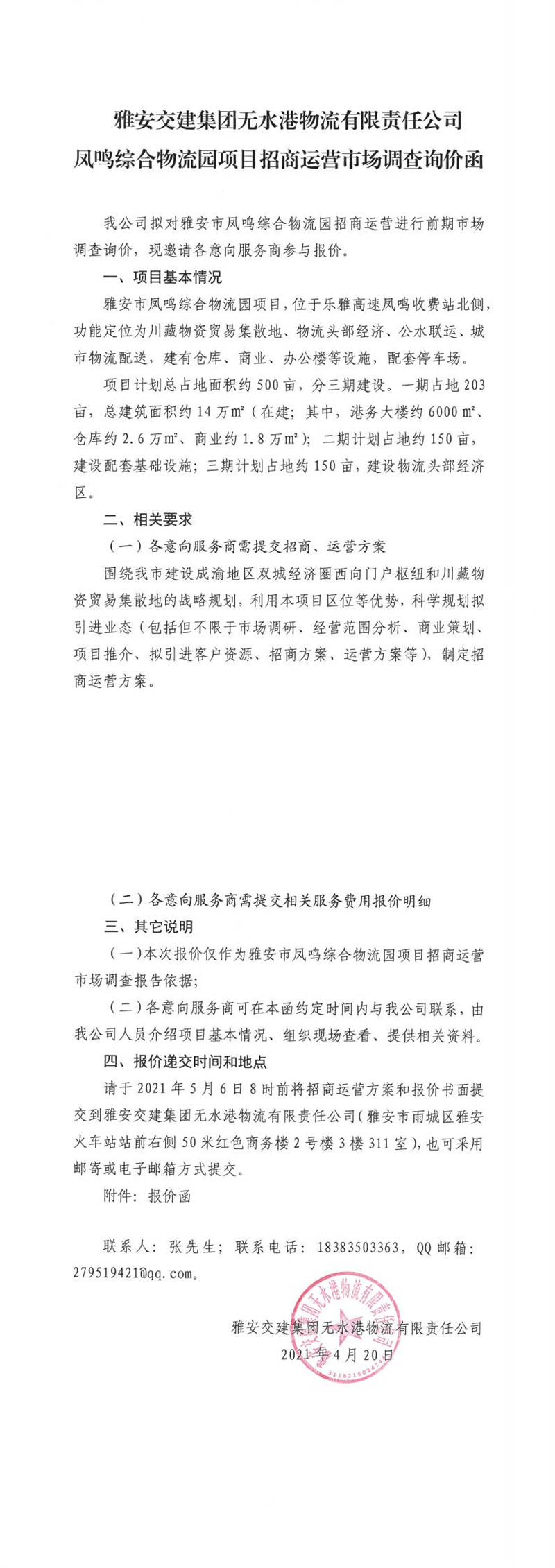 雅安交建集團(tuán)無水港物流有限責(zé)任公司鳳鳴綜合物流園項目招商運營市場調(diào)查詢價函