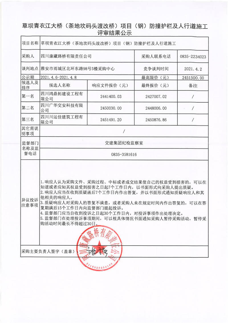 四川康藏路橋有限責(zé)任公司草壩青衣江大橋(茶地坎碼頭渡改橋)項(xiàng)目(鋼)防撞護(hù)欄及人行道施工評審結(jié)果公示