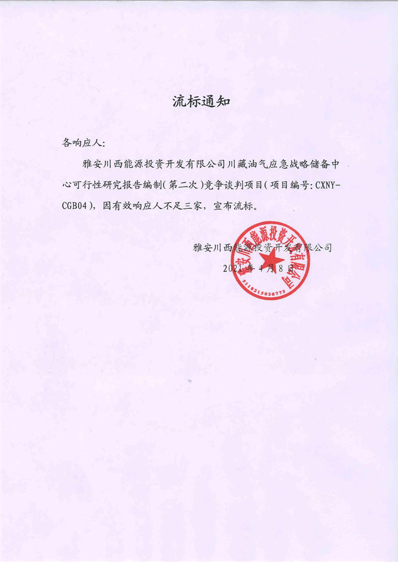 雅安川西能源投資開發(fā)有限公司川藏油氣應(yīng)急戰(zhàn)略儲備中心可行性研究報告編制(第二次)競爭談判項目流標(biāo)通知