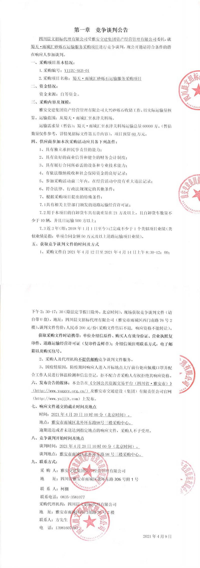 雅安交建集團資產經營管理有限公司蜀天.雨城匯砂礫石運輸服務采購項目競爭談判公告