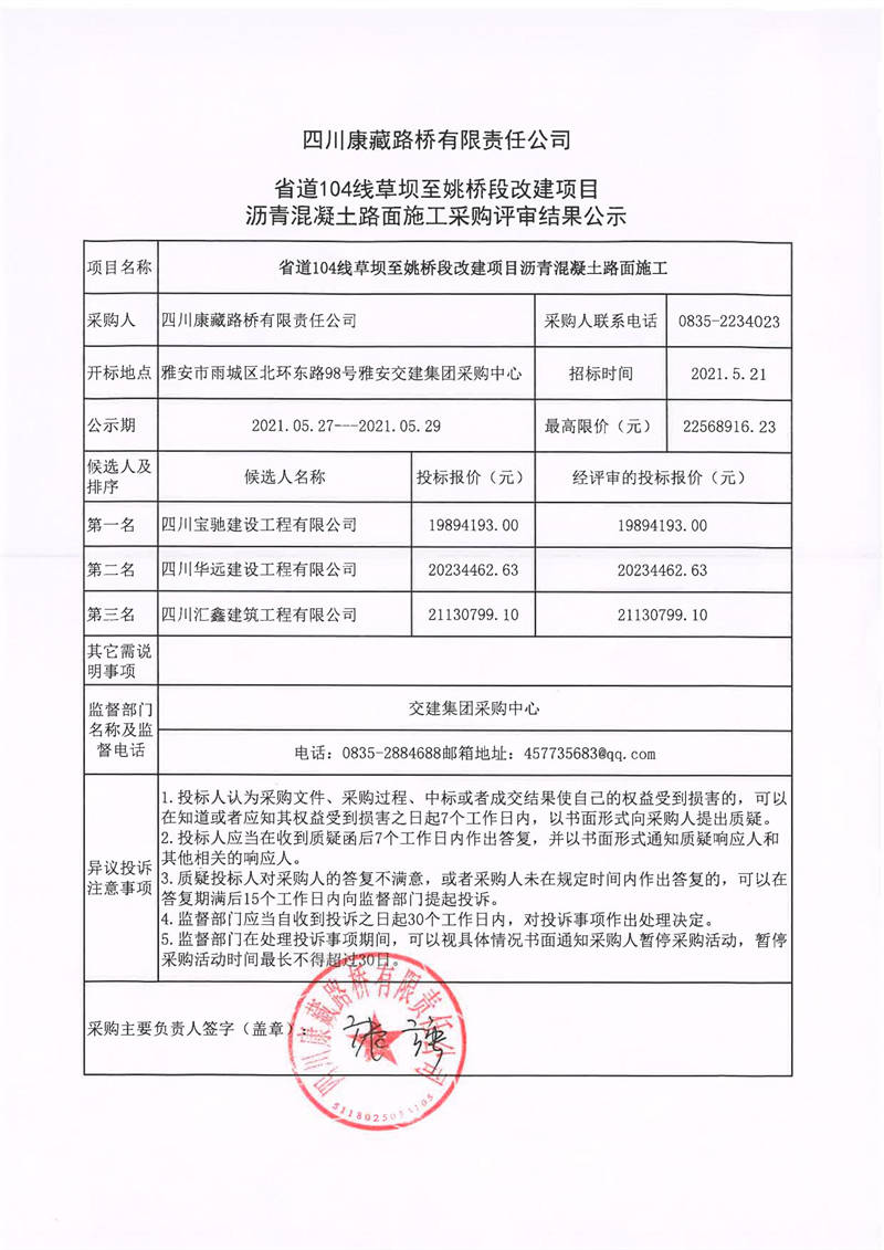 四川康藏路橋有限責(zé)任公司省道104線草壩至姚橋改建項(xiàng)目瀝青混凝土路面施工采購(gòu)評(píng)審結(jié)果公示