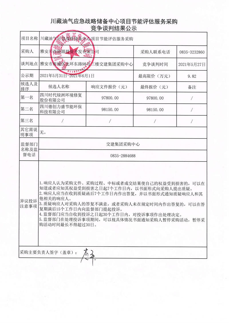 雅安川西能源投資開發(fā)有限公司川藏油氣應(yīng)急戰(zhàn)略儲(chǔ)備中心項(xiàng)目節(jié)能評(píng)估服務(wù)采購(gòu)競(jìng)爭(zhēng)談判結(jié)果公示