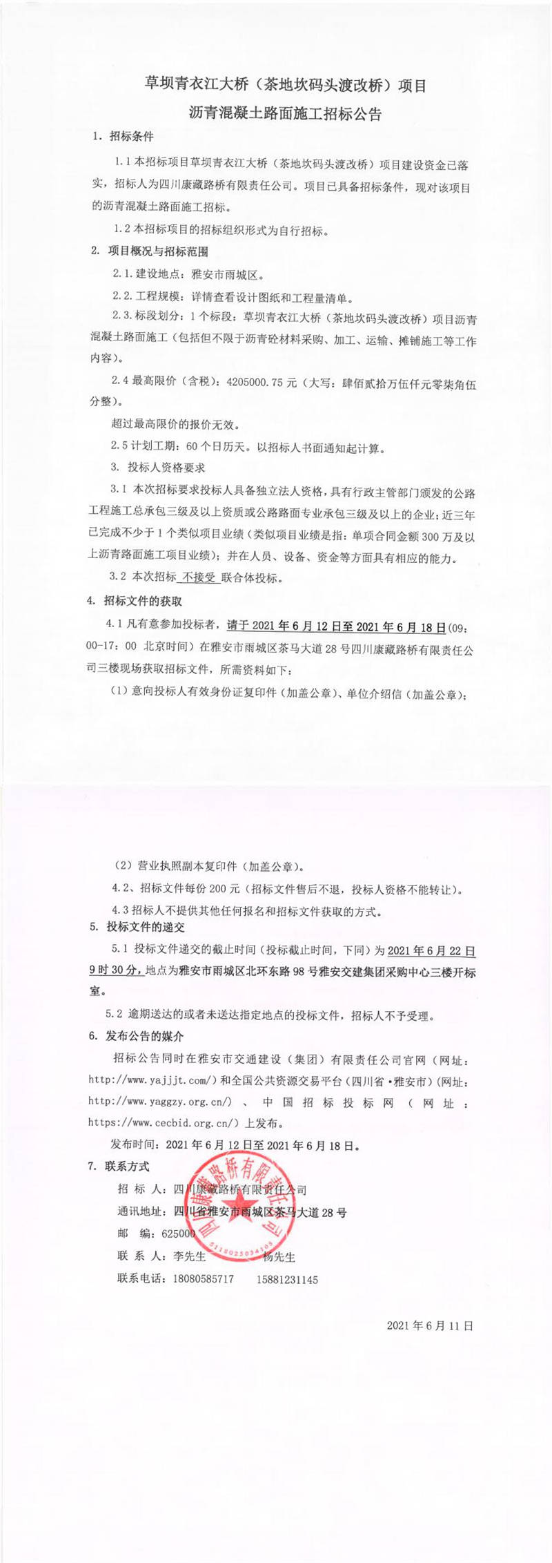 四川康藏路橋有限責任公司草壩青衣江大橋(茶地坎碼頭渡改橋)項目瀝青混凝土路面施工招標公告