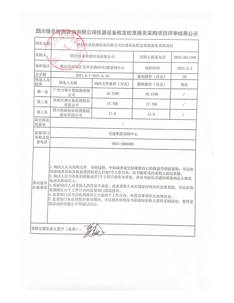 四川佳岳檢測(cè)咨詢(xún)有限公司儀器設(shè)備檢定校準(zhǔn)服務(wù)采購(gòu)項(xiàng)目評(píng)審結(jié)果公示