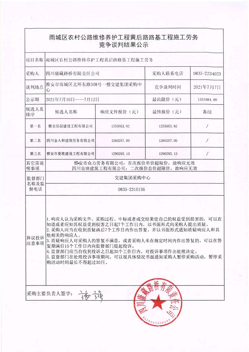 四川康藏路橋有限責任公司雨城區(qū)農村公路維修養(yǎng)護工程黃后路路基工程施工勞務競爭談判結果公示
