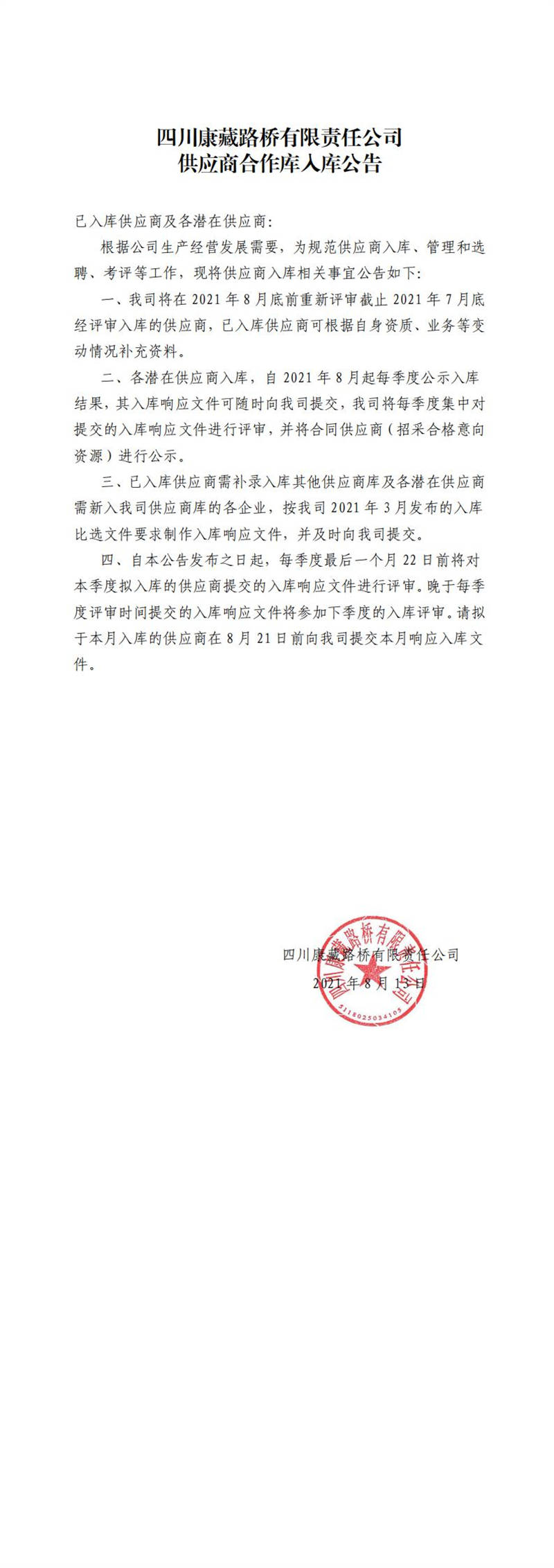 四川康藏路橋有限責(zé)任公司供應(yīng)商合作庫(kù)入庫(kù)公告