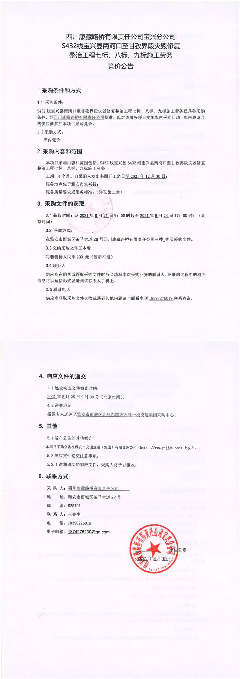 四川康藏路橋有限責(zé)任公司寶興分公司S432線寶興縣兩河口至甘孜界段災(zāi)毀修復(fù)整治工程七標、八標、九標施工勞務(wù)競價公告