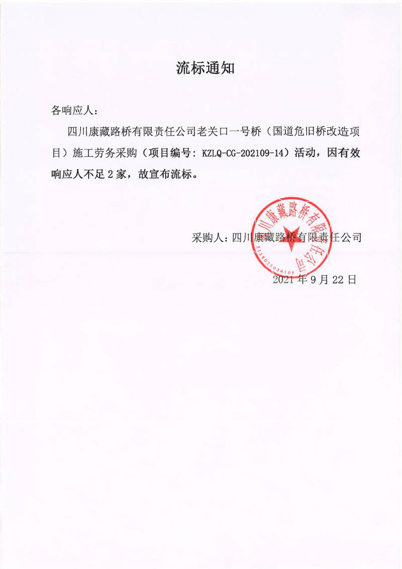 四川康藏路橋有限責任公司老關(guān)口一號橋(國道危舊橋改造項目)施工勞務采購流標通知