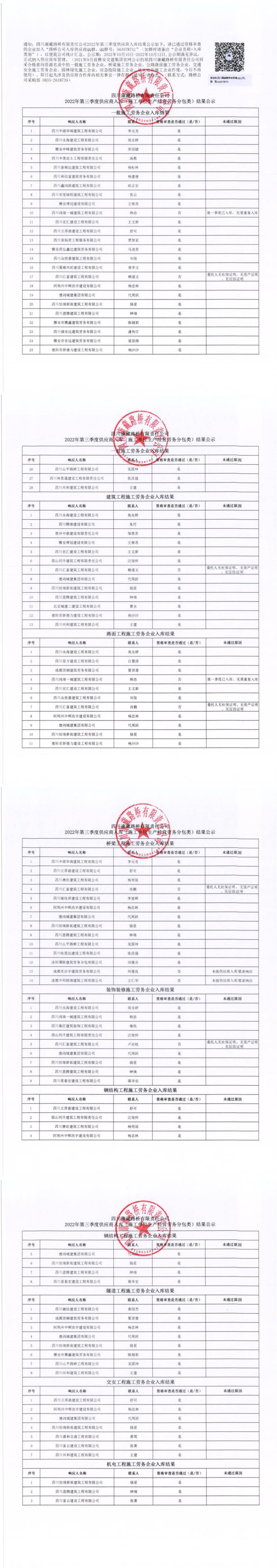 四川康藏路橋有限責(zé)任公司2022年第三季度供應(yīng)商入庫(施工單位生產(chǎn)經(jīng)營勞務(wù)分包類)結(jié)果公示