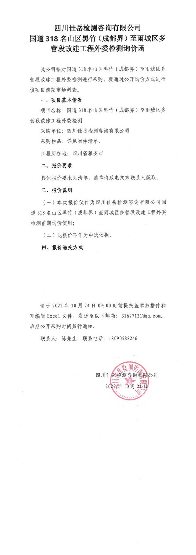 四川佳岳檢測(cè)咨詢(xún)有限公司國(guó)道318名山區(qū)黑竹(成都界)至雨城區(qū)多營(yíng)段改建工程外委檢測(cè)詢(xún)價(jià)函