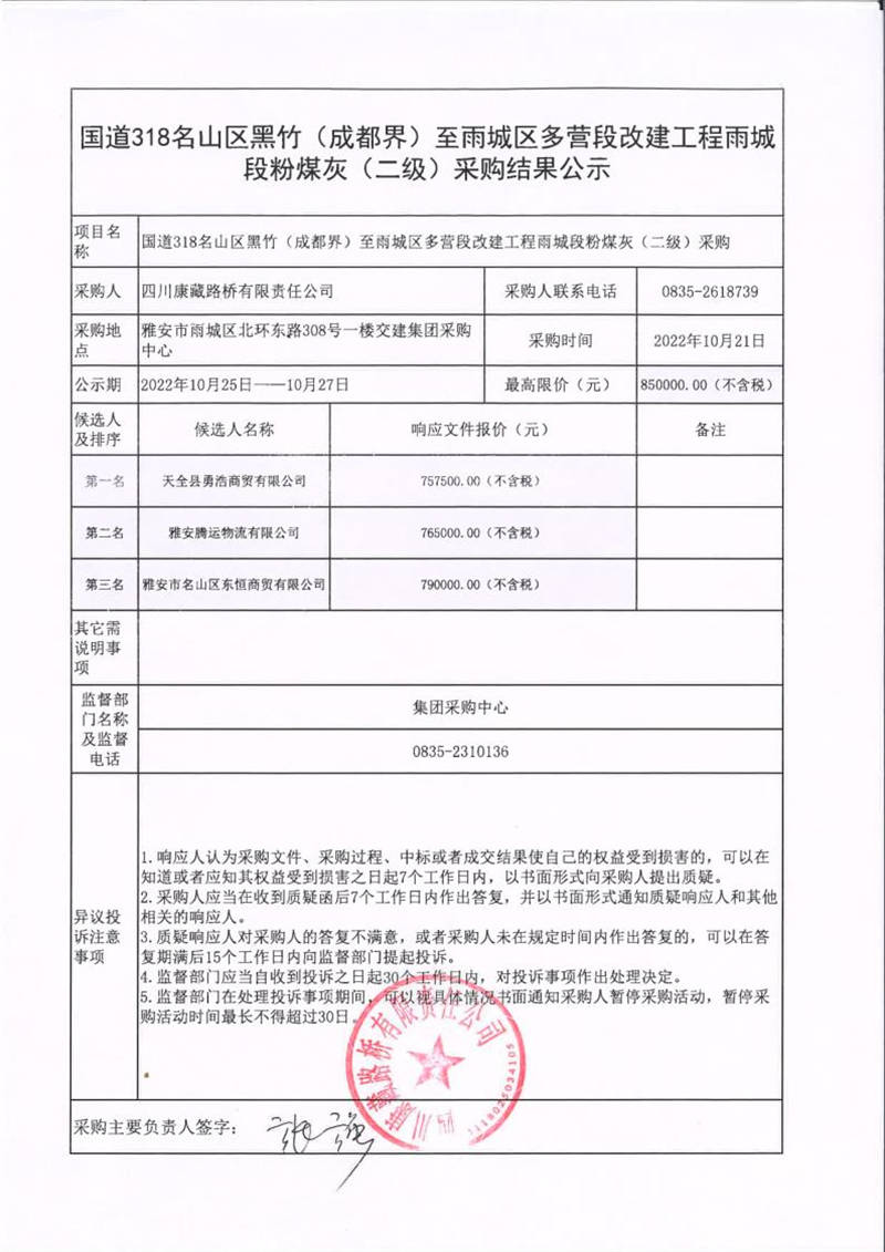 四川康藏路橋有限責任公司國道318名山區(qū)黑竹(成都界)至雨城區(qū)多營段改建工程雨城段粉煤灰(二級)采購結(jié)果公示