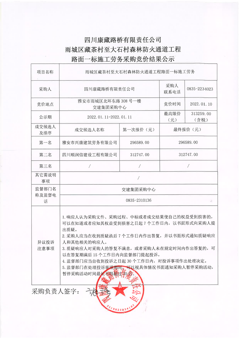 四川康藏路橋有限責(zé)任公司雨城區(qū)藏茶村至大石村森林防火通道工程路面一標(biāo)施工勞務(wù)采購競(jìng)價(jià)結(jié)果公示