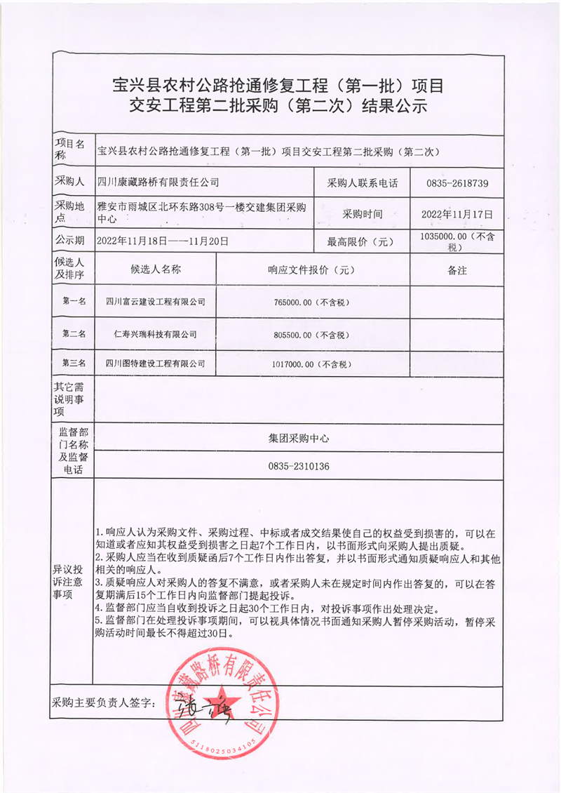 四川康藏路橋有限責任公司寶興縣農(nóng)村公路搶通修復工程(第一批)項目交安工程第二批采購(第二次)結(jié)果公示