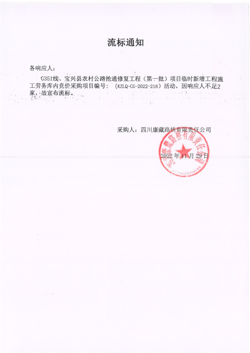 四川康藏路橋有限責(zé)任公司G351線、寶興縣農(nóng)村公路搶通修復(fù)工程(第一批)項(xiàng)目臨時(shí)新增工程施工勞務(wù)庫內(nèi)競(jìng)價(jià)采購(gòu)流標(biāo)通知