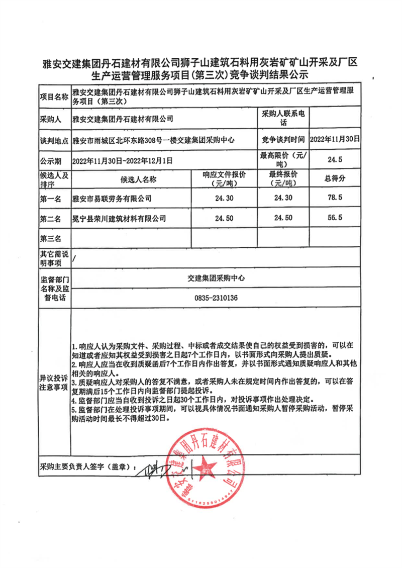 雅安交建集團丹石建材有限公司獅子山建筑石料用灰?guī)r礦礦山開采及廠區(qū)生產(chǎn)運營管理服務項目(第三次)競爭談判結果公示