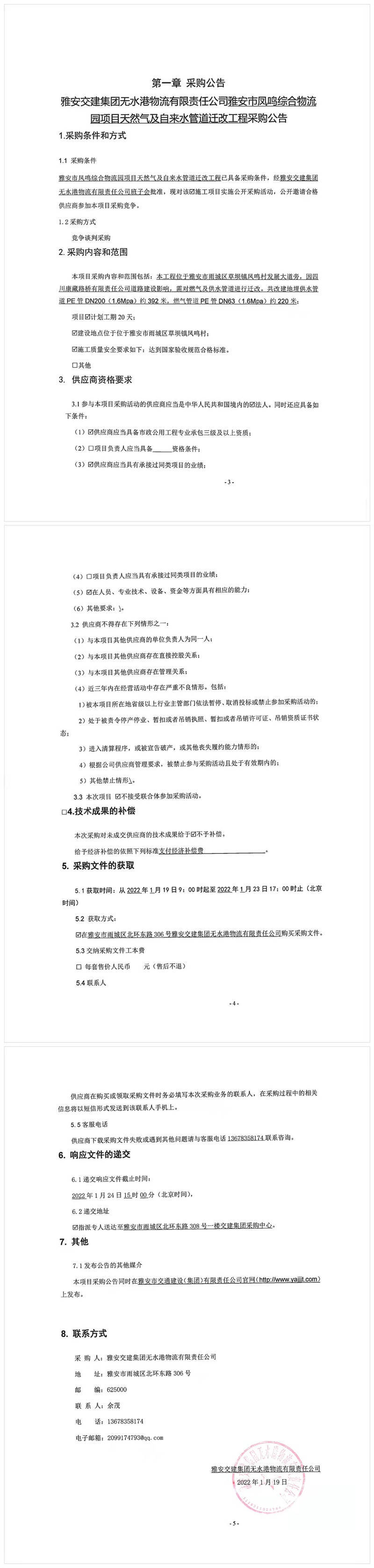 雅安交建集團(tuán)無水港物流有限責(zé)任公司雅安市鳳鳴綜合物流園項(xiàng)目天然氣及自來水管道遷改工程采購(gòu)公告