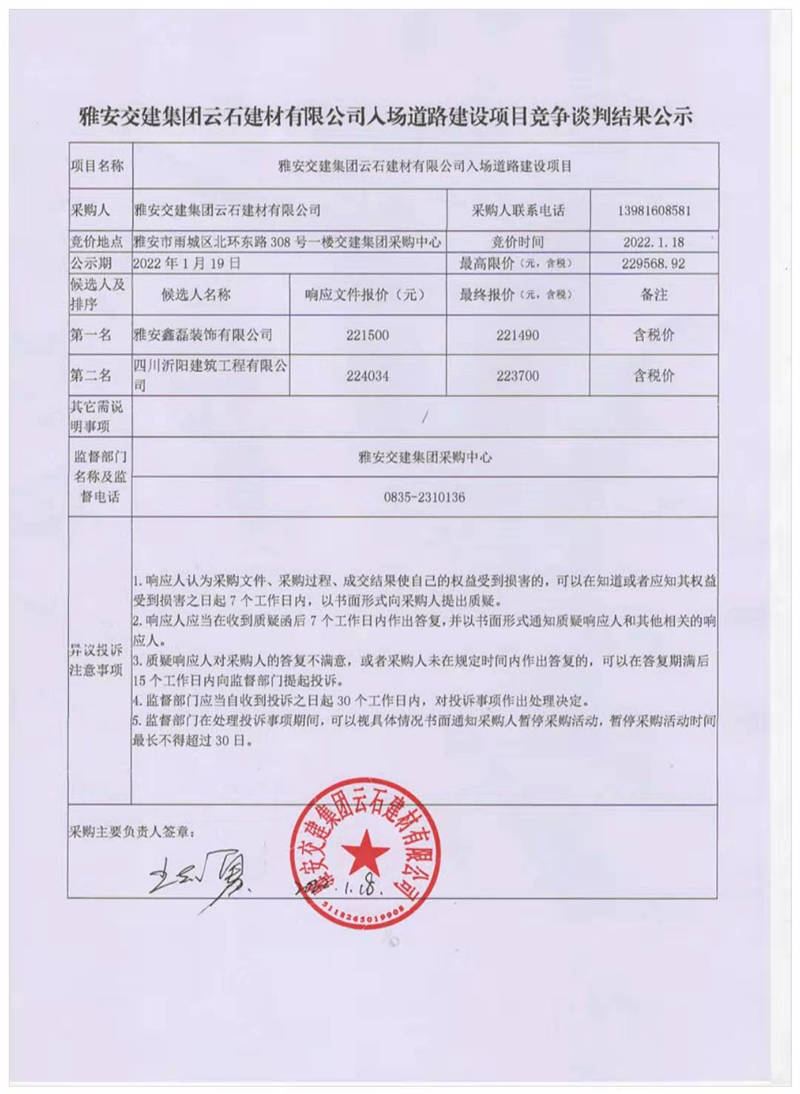 雅安交建集團云石建材有限公司入場道路建設項目競爭談判結果公示