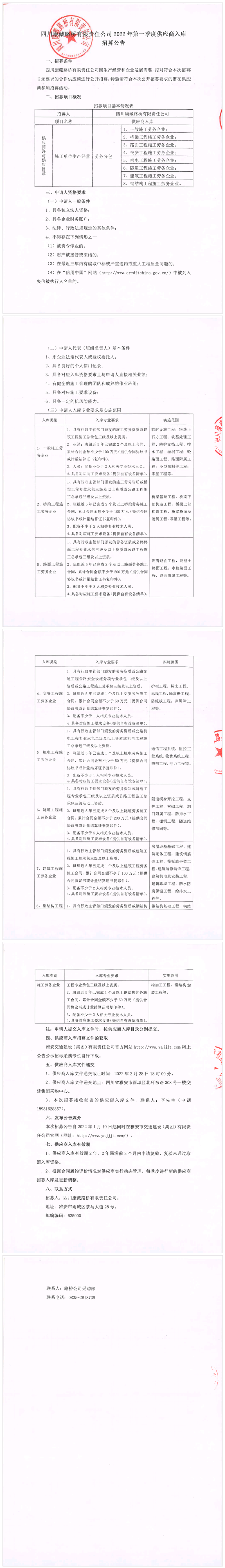 四川康藏路橋有限責(zé)任公司2022年第一季度供應(yīng)商入庫(kù)招募公告