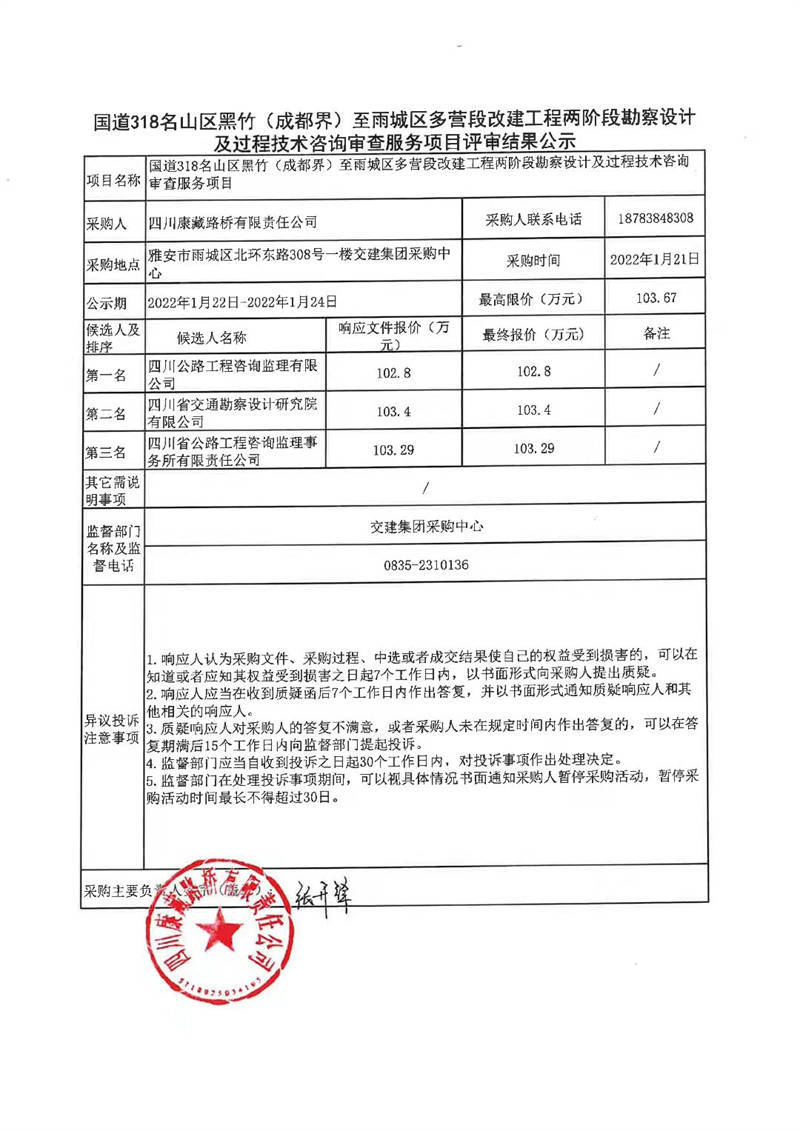 四川康藏路橋有限責(zé)任公司國道318名山區(qū)黑竹(成都界)至雨城區(qū)多營段改建工程兩階段勘察設(shè)計及過程技術(shù)咨詢審查服務(wù)項目評審結(jié)果公示