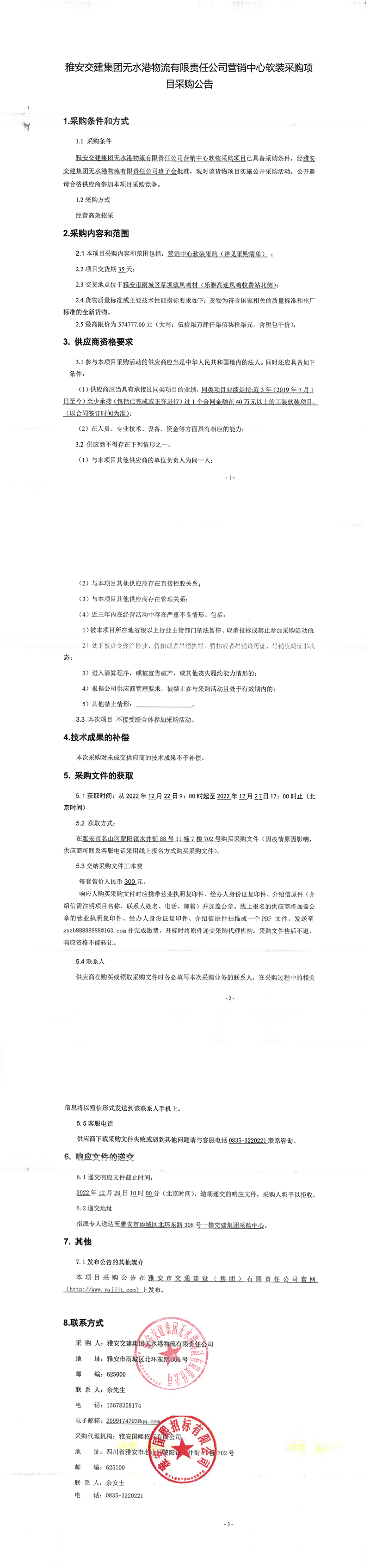 雅安交建集團無水港物流有限責任公司營銷中心軟裝采購項目采購公告