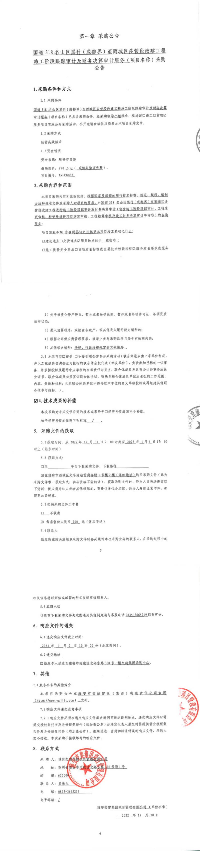雅安交建集團(tuán)項(xiàng)目管理有限公司國(guó)道318名山區(qū)黑竹(成都界)至雨城區(qū)多營(yíng)段改建工程施工階段跟蹤審計(jì)及財(cái)務(wù)決算審計(jì)服務(wù)采購(gòu)公告