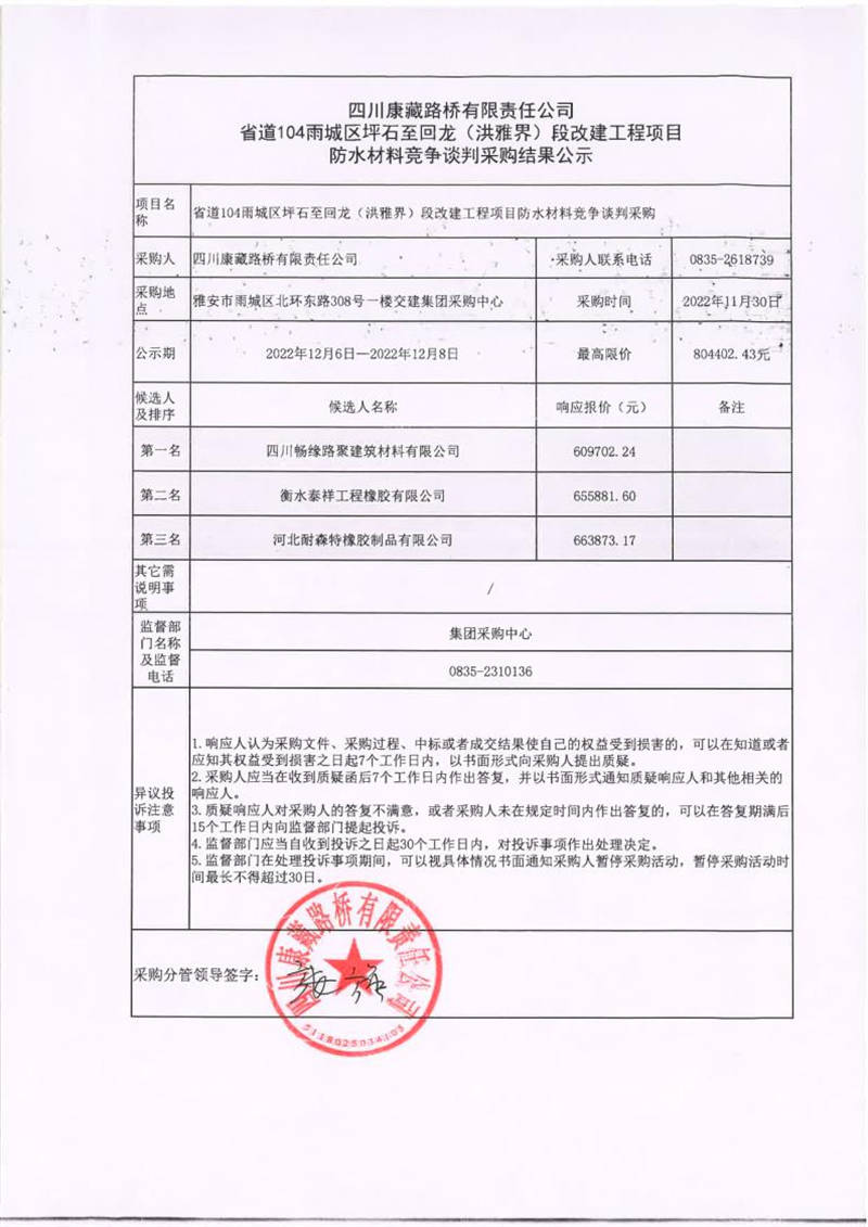 四川康藏路橋有限責(zé)任公司省道104雨城區(qū)坪石至回龍(洪雅界)段改建工程項(xiàng)目防水材料競(jìng)爭(zhēng)談判采購(gòu)結(jié)果公示