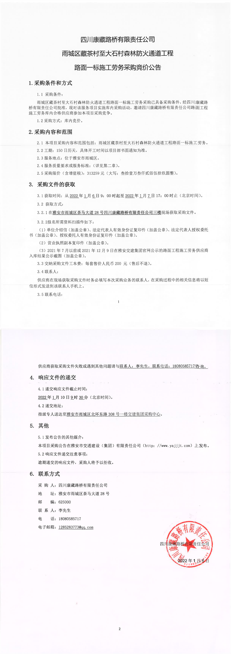 四川康藏路橋有限責(zé)任公司雨城區(qū)藏茶村至大石村森林防火通道工程路面一標施工勞務(wù)采購競價公告