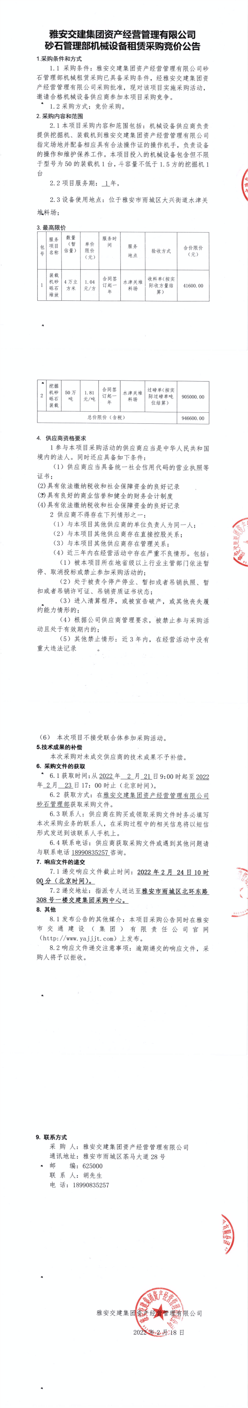 雅安交建集團資產經營管理有限公司砂石管理部機械設備租賃采購競價公告