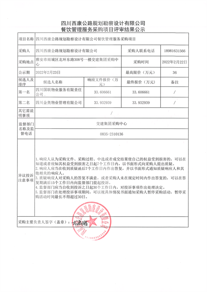 四川西康公路規(guī)劃勘察設(shè)計(jì)有限公司餐飲管理服務(wù)采購項(xiàng)目評(píng)審結(jié)果公示
