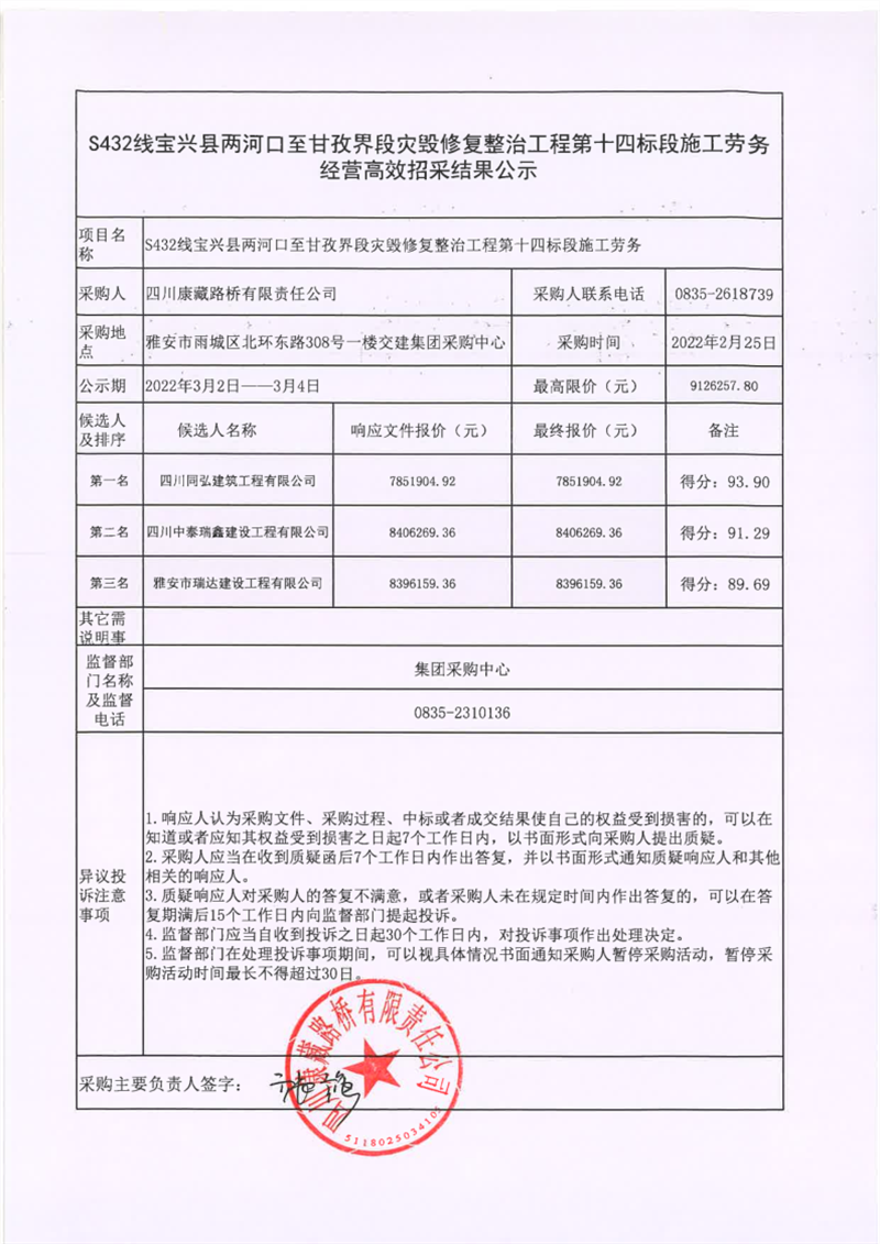 四川康藏路橋有限責任公司S432線寶興縣兩河口至甘孜界段災毀修復整治工程第十四標段施工勞務經(jīng)營高效招采結果公示