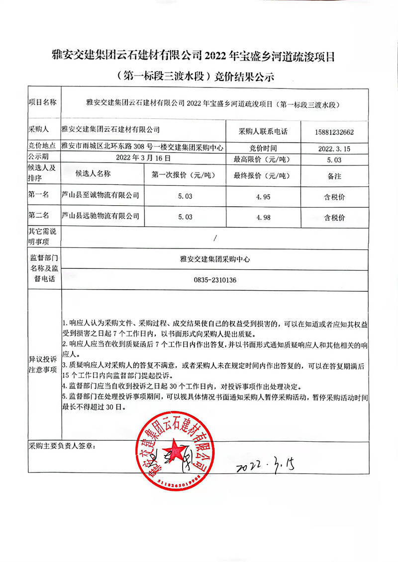 雅安交建集團云石建材有限公司2022年寶盛鄉(xiāng)河道疏浚項目(第一標段三渡水段)競價結果公示