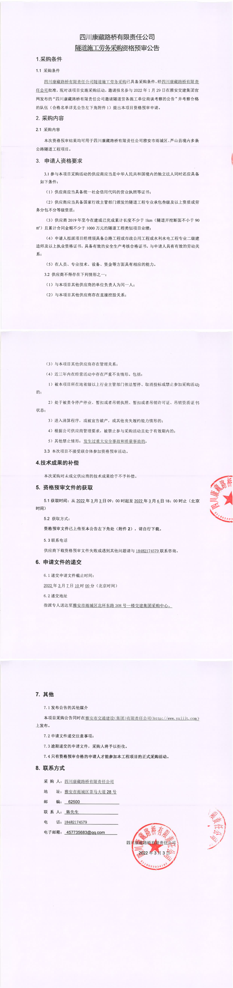 四川康藏路橋有限責(zé)任公司隧道施工勞務(wù)采購資格預(yù)審公告