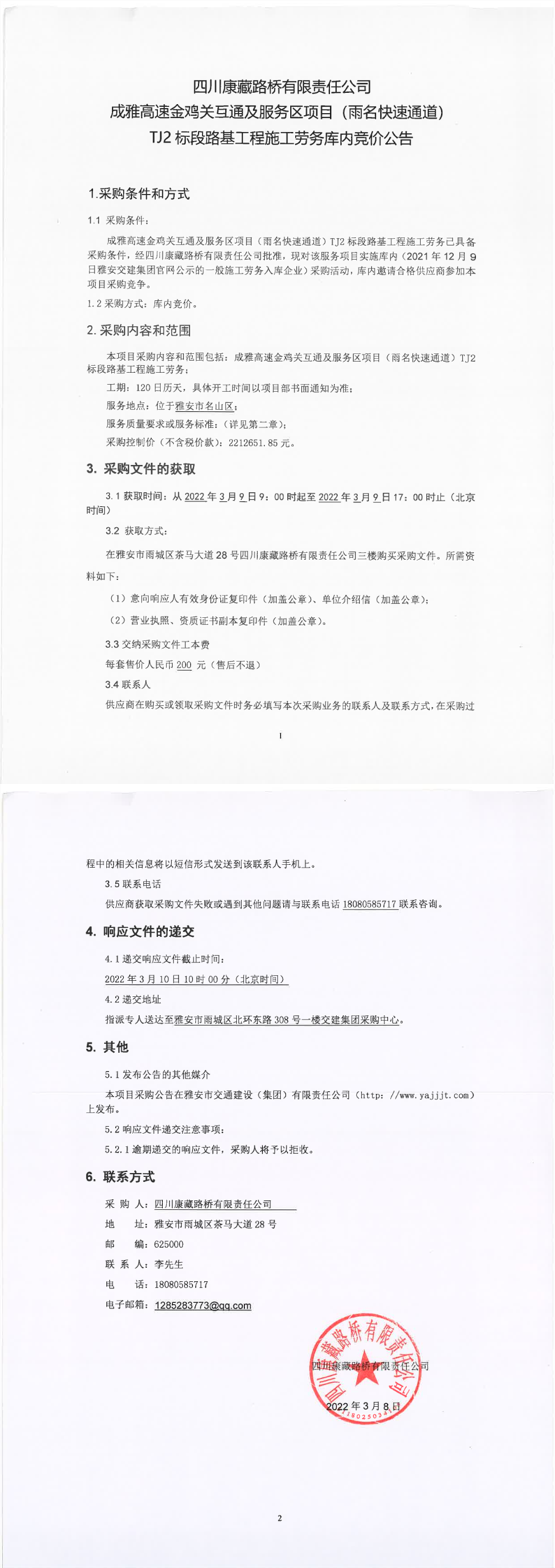 四川康藏路橋有限責任公司成雅高速金雞關互通及服務區(qū)項目(雨名快速通道)TJ2標段路基工程施工勞務庫內競價公告