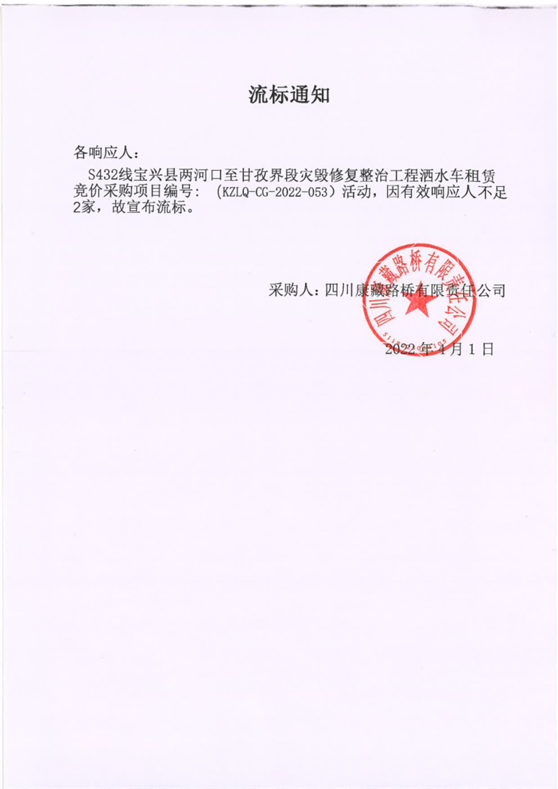 四川康藏路橋有限責(zé)任公司S432線(xiàn)寶興縣兩河口至甘孜界段災(zāi)毀修復(fù)整治工程灑水車(chē)租賃競(jìng)價(jià)采購(gòu)項(xiàng)目流標(biāo)通知