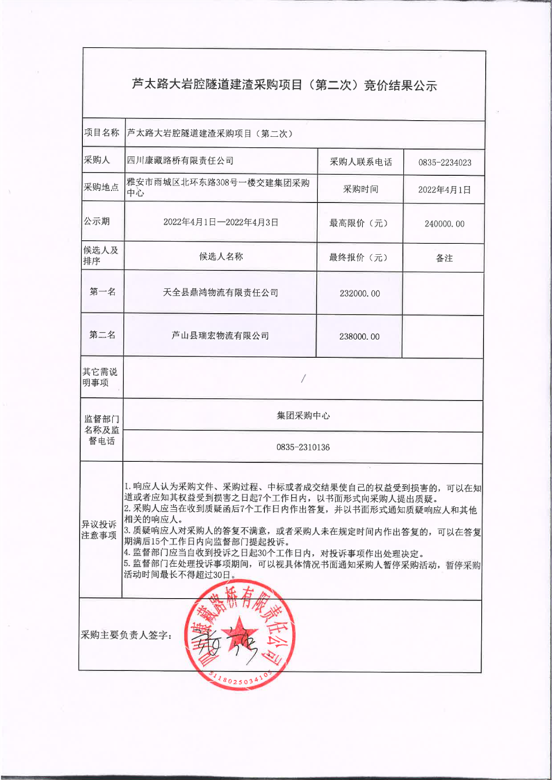 四川康藏路橋有限責(zé)任公司蘆太路大巖腔隧道建渣采購項(xiàng)目(第二次)競價結(jié)果公示