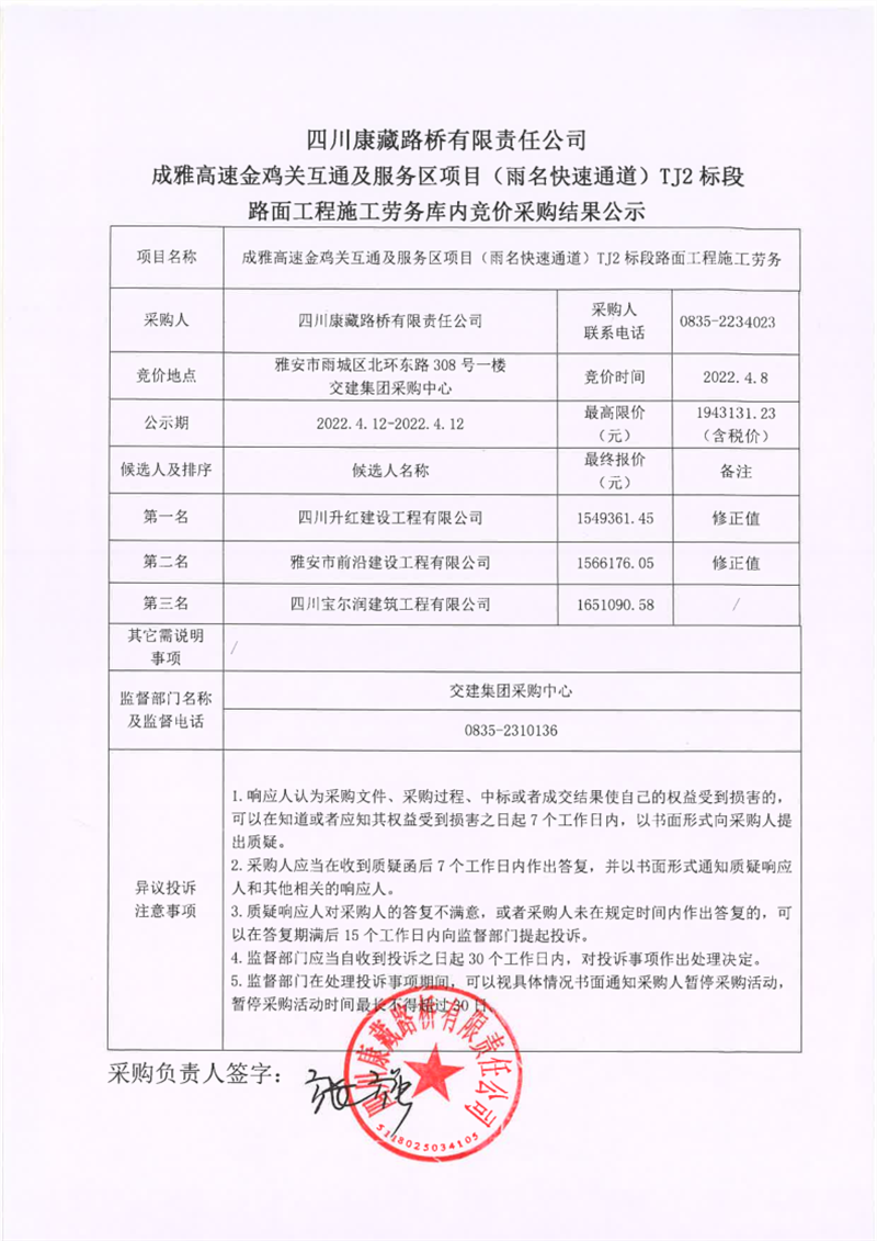 四川康藏路橋有限責(zé)任公司成雅高速金雞關(guān)互通及服務(wù)區(qū)項目(雨名快速通道)TJ2標段路面工程施工勞務(wù)庫內(nèi)競價采購結(jié)果公示