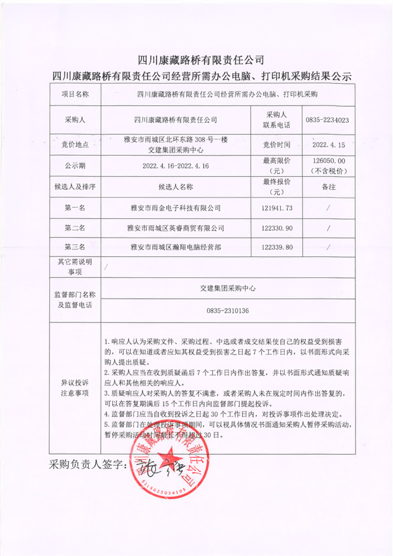 四川康藏路橋有限責任公司經營所需辦公電腦、打印機采購結果公示