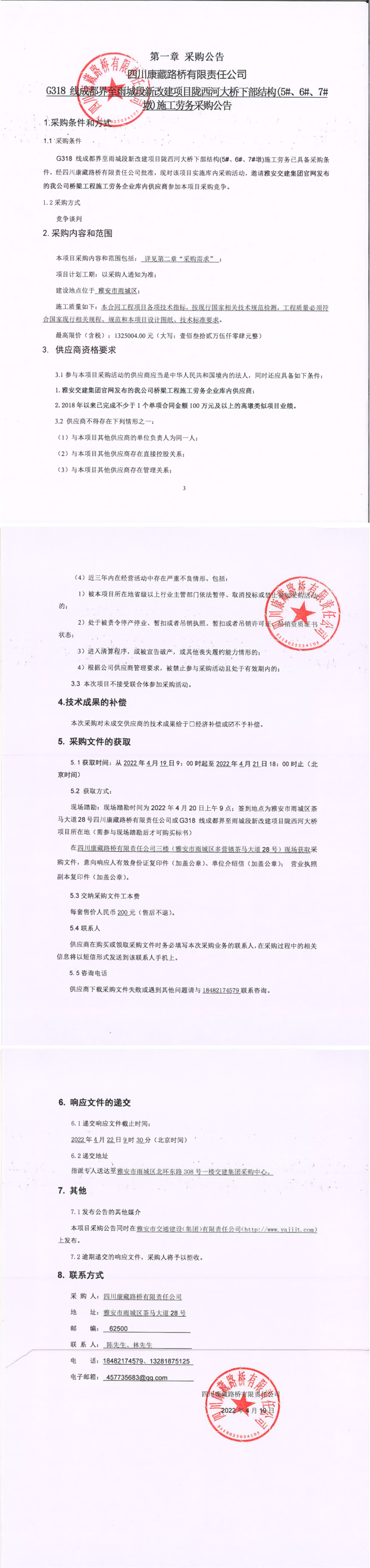 四川康藏路橋有限責任公司G318線成都界至雨城段新改建項目隴西河大橋下部結(jié)構(gòu)(5#、6#、7#墩)施工勞務(wù)采購公告