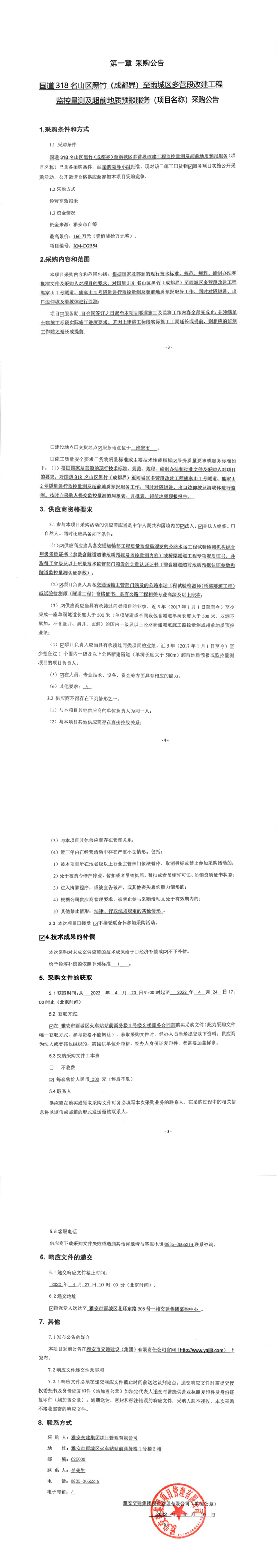 雅安交建集團項目管理有限公司國道318名山區(qū)黑竹(成都界)至雨城區(qū)多營段改建工程監(jiān)控量測及超前地質(zhì)預(yù)報服務(wù)采購公告