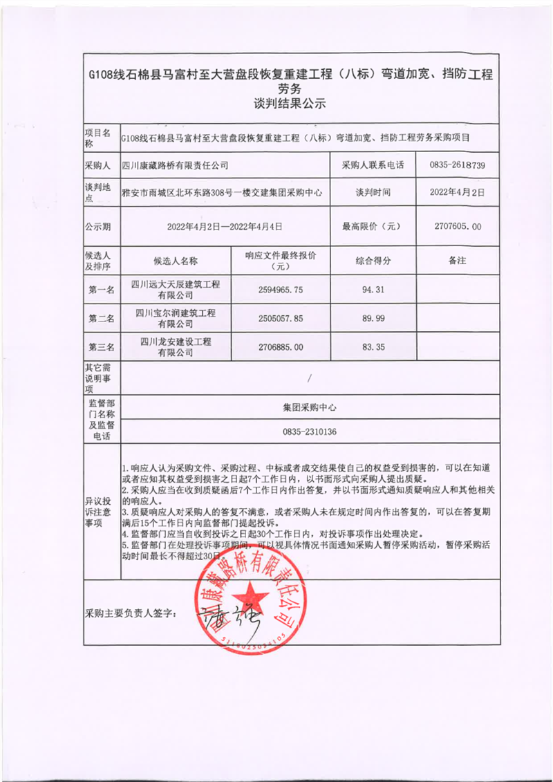 四川康藏路橋有限責(zé)任公司G108線石棉縣馬富村至大營(yíng)盤段恢復(fù)重建工程(八標(biāo))彎道加寬、擋防工程勞務(wù)談判結(jié)果公示